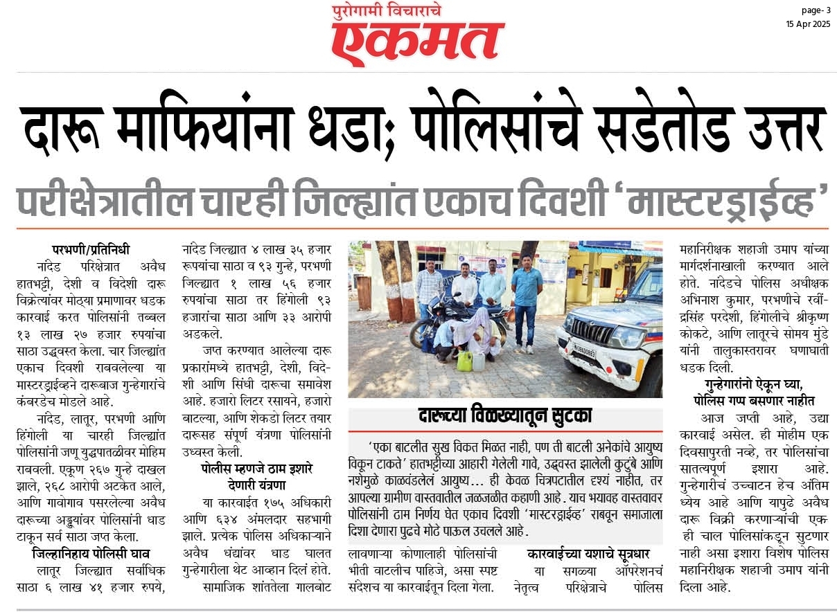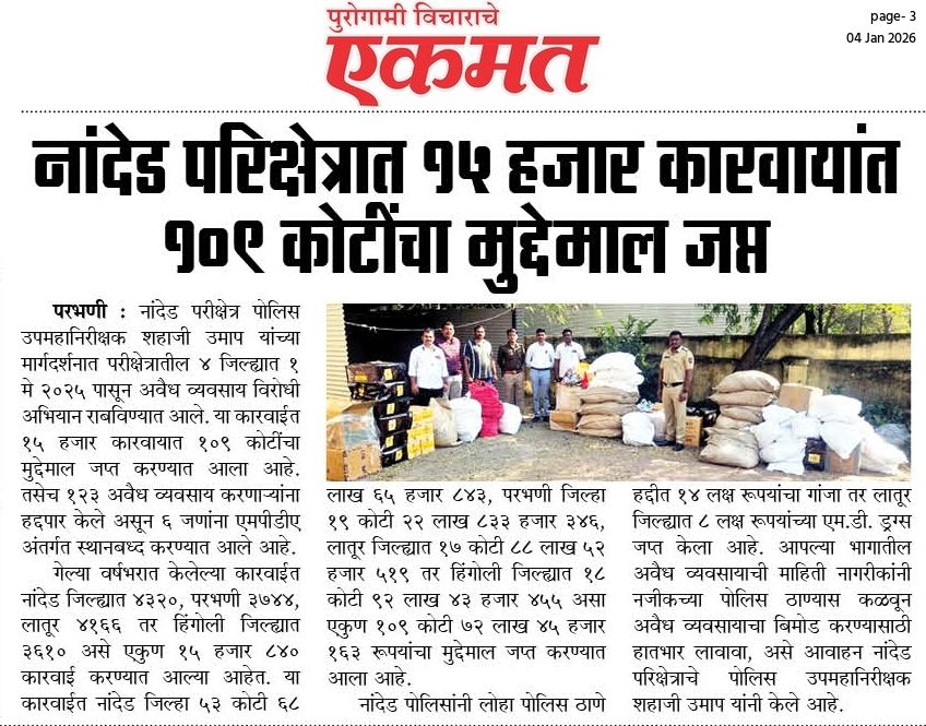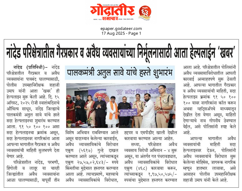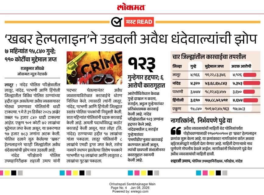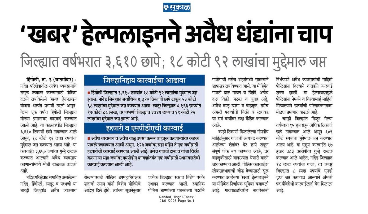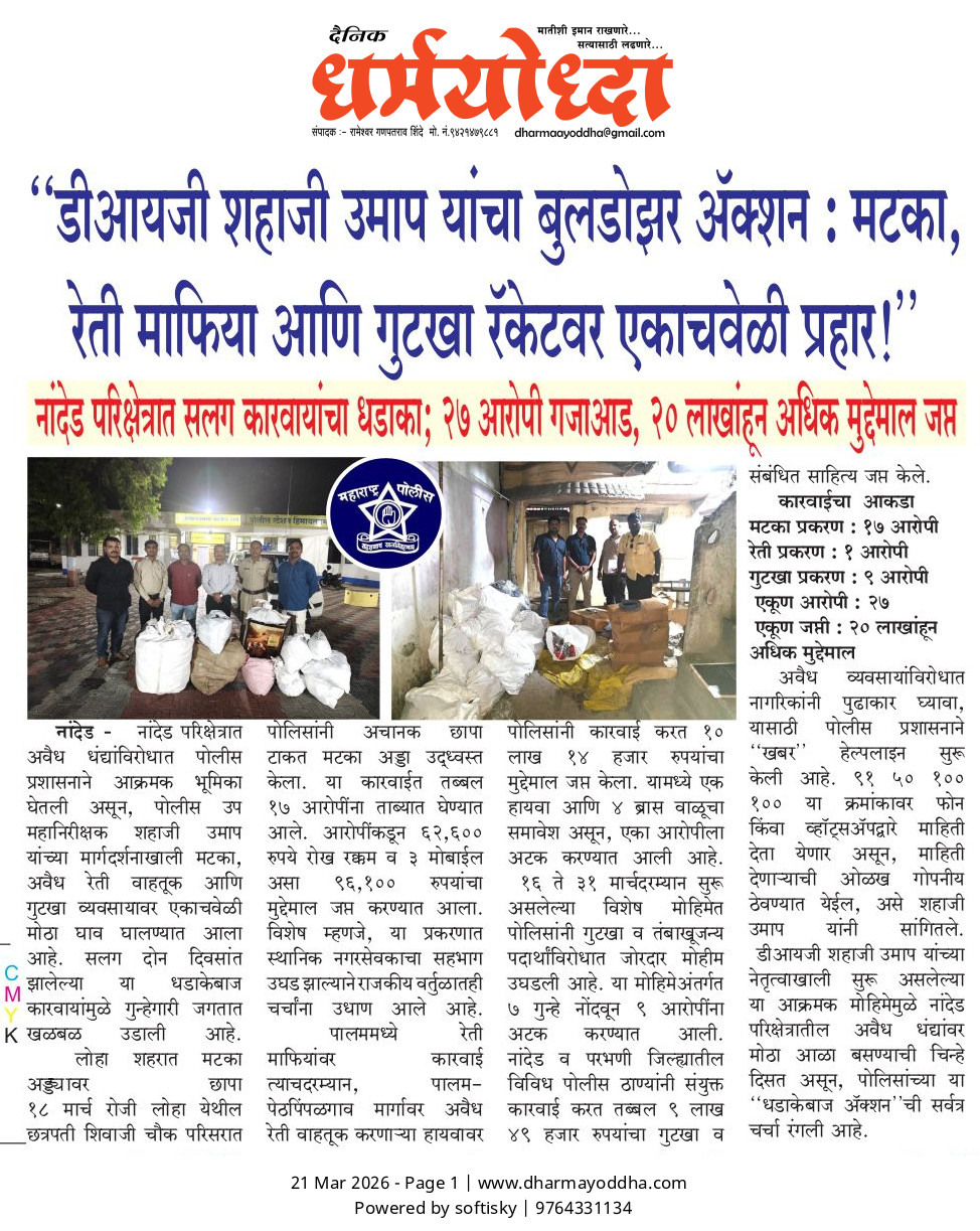 ◆ सगरोळी घाटावर धडक कारवाई; ८ पोकलेन, ३६ हायवा जप्त ◆ “डीआयजी शहाजी उमाप यांचा बुलडोजर ऑपरेशन : मटका, रेती माफिया आणि गुटखा रॅकेटवर एकाचवेळी प्रहार!” ◆ वाळूमाफियांना ‘महादणका’ उपसा करणाऱ्यांविरुद्ध कारवाई; २ कोटी ४ लाखांचा मुद्देमाल जप्त ◆ पोलीस उप महानिरीक्षक यांच्या पथकाची नांदेड मधील अवैध रेतीविरुध्द कारवाई 1 कोटी रुपयांची साधनसामुग्री व वाळू जप्त ◆ पोलीस उप महानिरीक्षक उमाप यांचा वाळू माफीयांना दणका! विमानतळ मुदखेड हद्दीत एक कोटींचा मुद्देमाल जप्त ६ आरोपी पकडले ◆ बारावीच्या परिक्षा केंद्रावर भेट ◆ पोलीस उप महानिरीक्षक यांच्या पथकाचा अवैध रेती उत्खनन व वाहतुक करणाऱ्यांवर छापा 2 कोटी रुपयांची साधनसामुग्री व वाळू जप्त ◆ पोलीस उपमहानिरीक्षक यांचे पथकाची कार्यवाही गावठी पिस्तूल, तीन जिवंत काडतूसासह आरोपी ताब्यात जुगार अड्डयावर धाड, 25 जणांवर गुन्हे दाखल ◆ पोलीस उपमहानिरीक्षक यांचे हिंगोली व नांदेड मध्ये छापे 73 लाख गुटख्यांच्या 1 कोटी 3 लाख रुपयांचा मुद्देमाल जप्त ◆ छत्रपती संभाजीनगर दैनिक लोकमत बातमी – खबर हेल्पलाईनने उडवली अवैध धंदेवाल्यांची झोप ◆ अवैध व्यवसाय विरोधी अभियान ◆ अवैध व्यवसाय विरोधी अभियान (123) अवैध व्यवसायिक हद्दपार, तर (6) जण MPDA अंतर्गत स्थानबद्ध नांदेड परिक्षेत्रात वर्षभरात 15,000 कारवाया, 109 कोटी रुपयांचा मुद्देमाल जप्त ◆ Nanded Police range seizes assets worth rs. 109 crore in year -long drive ◆ अवैध व्यवसाय विरोधी अभियान ◆ अवैध व्यवसाय विरोधी अभियान (123) अवैध व्यवसायिक हद्दपार, तर (6) जण MPDA अंतर्गत स्थानबद्ध नांदेड परिक्षेत्रात वर्षभरात 15,000 कारवाया, 109 कोटी रुपयांचा मुद्देमाल जप्त ◆ मा. पोलीस उप महानिरीक्षक श्री शहाजी उमाप यांनी हिंगोली जिल्हा पोलीस स्टेशन नरसी नामदेव येथे वार्षिक तपासणी दरम्यान भेट देवून ठाणे परिसराची पाहणी केली. ◆ खबर हेल्पलाईन 9150 100 100 ठरणार अवैध धंदेवाल्यांचा कर्दनकाळ ◆ अवैध व्यवसाय विरोधी अभियान- 5 सप्टेंबरच्या तिसऱ्या आठवड्यात सुमारे 438 कारवाया, 50 लाखाहून अधिक रक्कमेचा मुद्देमाल जप्त. ◆ नांदेड परिक्षेत्रातील गैरप्रकार व अवैध व्यवसायांच्या निर्मूलनासाठी आता हेल्पलाइन खबर पालकमंत्री मा. ना. श्री अतुल सावे यांचे हस्ते शुभारंभ ◆ नांदेड परिक्षेत्रातील पोलीस ठाण्यांच्या मूल्यमापनात सोनखेड पोलीस ठाणे सलग चौथ्यांना अव्वल ◆ जून मध्ये 2000 कारवाया, सात कोटींचा मुद्देमाल जप्त ◆ अवैध व्यवसाय विरोधी अभियानात महिनाभरात 939 कारवाया ◆ अवैध व्यवसाय अभियान -2 : सात कोटींचा मुद्देमाल जप्त ◆ नि:शस्त्र पोलीस निरीक्षकांच्या परिक्षेत्रांतर्गत सार्वत्रिक बदल्या - २०२५ ◆ नि:शस्त्र पोलीस उप निरीक्षकांच्या परिक्षेत्रांतर्गत सार्वत्रिक विनंती बदल्या - २०२५ ◆ नि:शस्त्र पोलीस उ