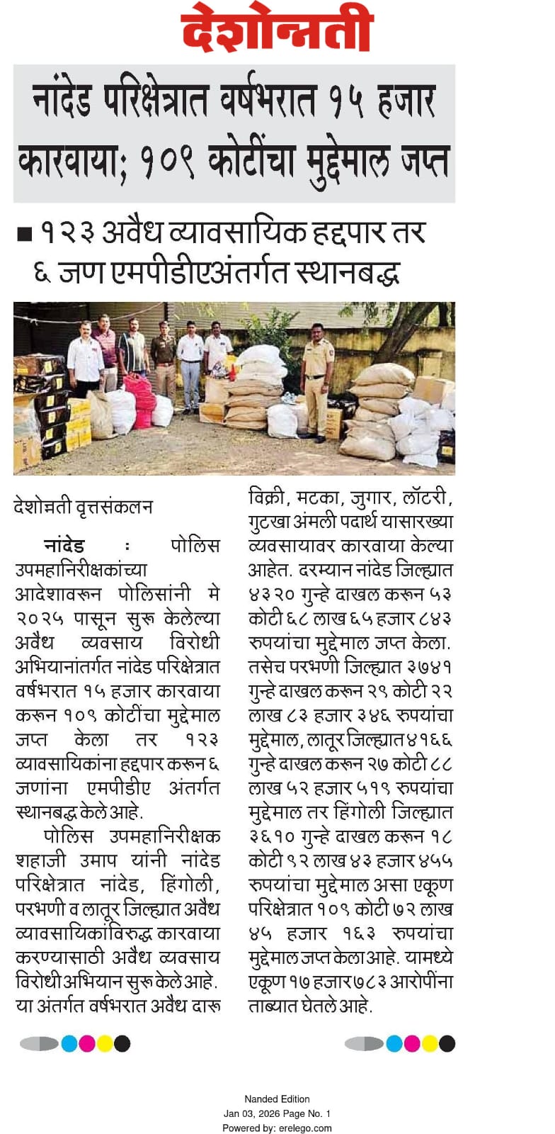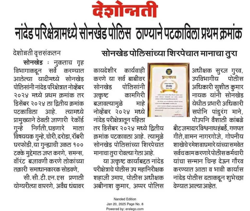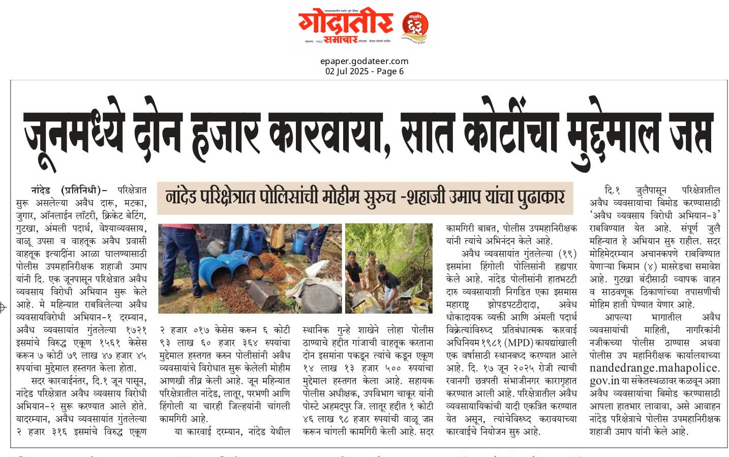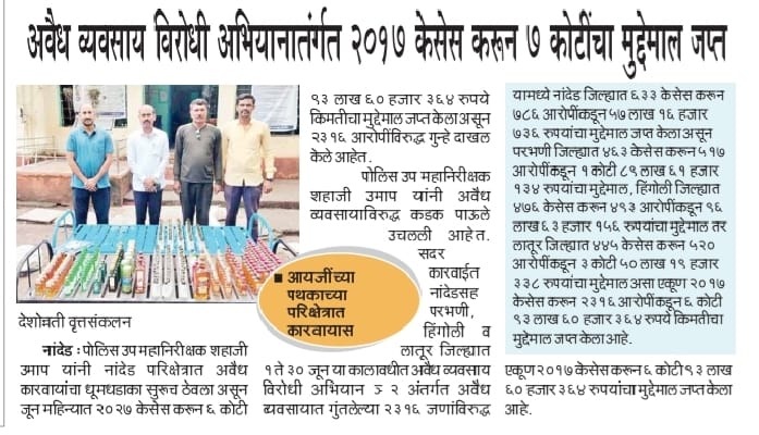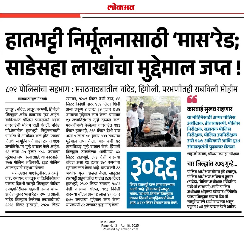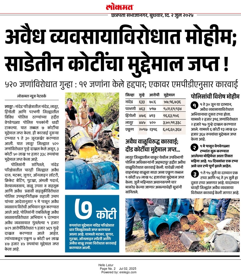 ◆ सगरोळी घाटावर धडक कारवाई; ८ पोकलेन, ३६ हायवा जप्त ◆ “डीआयजी शहाजी उमाप यांचा बुलडोजर ऑपरेशन : मटका, रेती माफिया आणि गुटखा रॅकेटवर एकाचवेळी प्रहार!” ◆ वाळूमाफियांना ‘महादणका’ उपसा करणाऱ्यांविरुद्ध कारवाई; २ कोटी ४ लाखांचा मुद्देमाल जप्त ◆ पोलीस उप महानिरीक्षक यांच्या पथकाची नांदेड मधील अवैध रेतीविरुध्द कारवाई 1 कोटी रुपयांची साधनसामुग्री व वाळू जप्त ◆ पोलीस उप महानिरीक्षक उमाप यांचा वाळू माफीयांना दणका! विमानतळ मुदखेड हद्दीत एक कोटींचा मुद्देमाल जप्त ६ आरोपी पकडले ◆ बारावीच्या परिक्षा केंद्रावर भेट ◆ पोलीस उप महानिरीक्षक यांच्या पथकाचा अवैध रेती उत्खनन व वाहतुक करणाऱ्यांवर छापा 2 कोटी रुपयांची साधनसामुग्री व वाळू जप्त ◆ पोलीस उपमहानिरीक्षक यांचे पथकाची कार्यवाही गावठी पिस्तूल, तीन जिवंत काडतूसासह आरोपी ताब्यात जुगार अड्डयावर धाड, 25 जणांवर गुन्हे दाखल ◆ पोलीस उपमहानिरीक्षक यांचे हिंगोली व नांदेड मध्ये छापे 73 लाख गुटख्यांच्या 1 कोटी 3 लाख रुपयांचा मुद्देमाल जप्त ◆ छत्रपती संभाजीनगर दैनिक लोकमत बातमी – खबर हेल्पलाईनने उडवली अवैध धंदेवाल्यांची झोप ◆ अवैध व्यवसाय विरोधी अभियान ◆ अवैध व्यवसाय विरोधी अभियान (123) अवैध व्यवसायिक हद्दपार, तर (6) जण MPDA अंतर्गत स्थानबद्ध नांदेड परिक्षेत्रात वर्षभरात 15,000 कारवाया, 109 कोटी रुपयांचा मुद्देमाल जप्त ◆ Nanded Police range seizes assets worth rs. 109 crore in year -long drive ◆ अवैध व्यवसाय विरोधी अभियान ◆ अवैध व्यवसाय विरोधी अभियान (123) अवैध व्यवसायिक हद्दपार, तर (6) जण MPDA अंतर्गत स्थानबद्ध नांदेड परिक्षेत्रात वर्षभरात 15,000 कारवाया, 109 कोटी रुपयांचा मुद्देमाल जप्त ◆ मा. पोलीस उप महानिरीक्षक श्री शहाजी उमाप यांनी हिंगोली जिल्हा पोलीस स्टेशन नरसी नामदेव येथे वार्षिक तपासणी दरम्यान भेट देवून ठाणे परिसराची पाहणी केली. ◆ खबर हेल्पलाईन 9150 100 100 ठरणार अवैध धंदेवाल्यांचा कर्दनकाळ ◆ अवैध व्यवसाय विरोधी अभियान- 5 सप्टेंबरच्या तिसऱ्या आठवड्यात सुमारे 438 कारवाया, 50 लाखाहून अधिक रक्कमेचा मुद्देमाल जप्त. ◆ नांदेड परिक्षेत्रातील गैरप्रकार व अवैध व्यवसायांच्या निर्मूलनासाठी आता हेल्पलाइन खबर पालकमंत्री मा. ना. श्री अतुल सावे यांचे हस्ते शुभारंभ ◆ नांदेड परिक्षेत्रातील पोलीस ठाण्यांच्या मूल्यमापनात सोनखेड पोलीस ठाणे सलग चौथ्यांना अव्वल ◆ जून मध्ये 2000 कारवाया, सात कोटींचा मुद्देमाल जप्त ◆ अवैध व्यवसाय विरोधी अभियानात महिनाभरात 939 कारवाया ◆ अवैध व्यवसाय अभियान -2 : सात कोटींचा मुद्देमाल जप्त ◆ नि:शस्त्र पोलीस निरीक्षकांच्या परिक्षेत्रांतर्गत सार्वत्रिक बदल्या - २०२५ ◆ नि:शस्त्र पोलीस उप निरीक्षकांच्या परिक्षेत्रांतर्गत सार्वत्रिक विनंती बदल्या - २०२५ ◆ नि:शस्त्र पोलीस उ