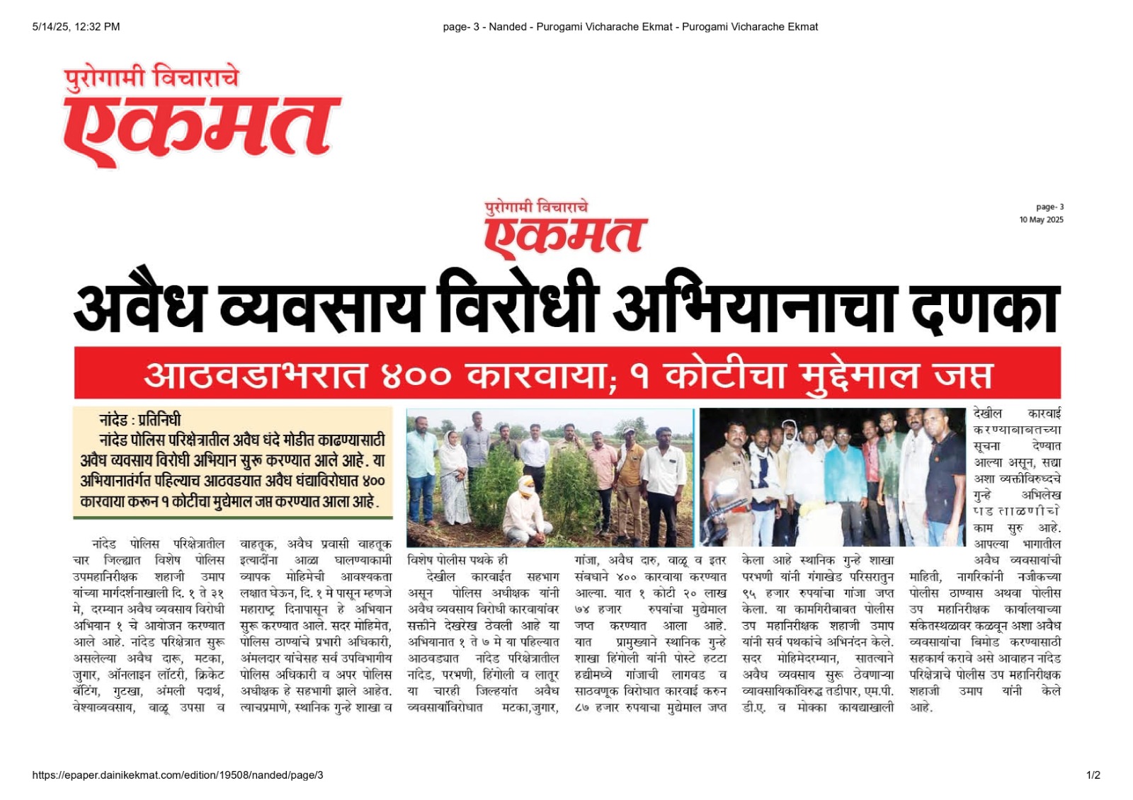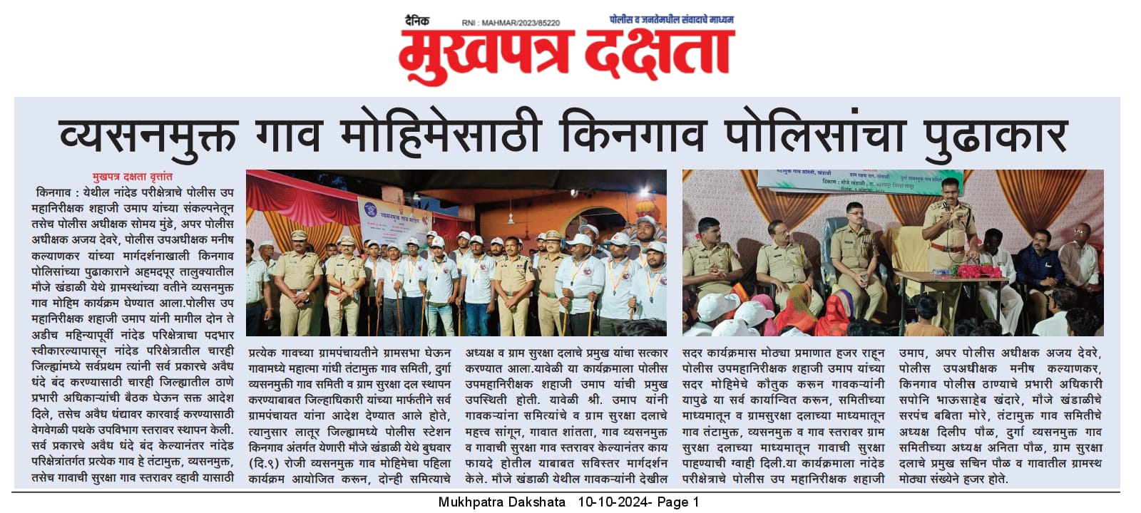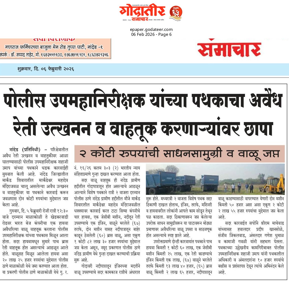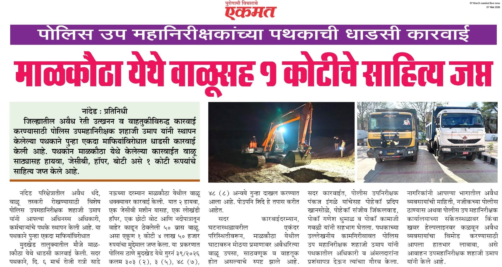 ◆ सगरोळी घाटावर धडक कारवाई; ८ पोकलेन, ३६ हायवा जप्त ◆ “डीआयजी शहाजी उमाप यांचा बुलडोजर ऑपरेशन : मटका, रेती माफिया आणि गुटखा रॅकेटवर एकाचवेळी प्रहार!” ◆ वाळूमाफियांना ‘महादणका’ उपसा करणाऱ्यांविरुद्ध कारवाई; २ कोटी ४ लाखांचा मुद्देमाल जप्त ◆ पोलीस उप महानिरीक्षक यांच्या पथकाची नांदेड मधील अवैध रेतीविरुध्द कारवाई 1 कोटी रुपयांची साधनसामुग्री व वाळू जप्त ◆ पोलीस उप महानिरीक्षक उमाप यांचा वाळू माफीयांना दणका! विमानतळ मुदखेड हद्दीत एक कोटींचा मुद्देमाल जप्त ६ आरोपी पकडले ◆ बारावीच्या परिक्षा केंद्रावर भेट ◆ पोलीस उप महानिरीक्षक यांच्या पथकाचा अवैध रेती उत्खनन व वाहतुक करणाऱ्यांवर छापा 2 कोटी रुपयांची साधनसामुग्री व वाळू जप्त ◆ पोलीस उपमहानिरीक्षक यांचे पथकाची कार्यवाही गावठी पिस्तूल, तीन जिवंत काडतूसासह आरोपी ताब्यात जुगार अड्डयावर धाड, 25 जणांवर गुन्हे दाखल ◆ पोलीस उपमहानिरीक्षक यांचे हिंगोली व नांदेड मध्ये छापे 73 लाख गुटख्यांच्या 1 कोटी 3 लाख रुपयांचा मुद्देमाल जप्त ◆ छत्रपती संभाजीनगर दैनिक लोकमत बातमी – खबर हेल्पलाईनने उडवली अवैध धंदेवाल्यांची झोप ◆ अवैध व्यवसाय विरोधी अभियान ◆ अवैध व्यवसाय विरोधी अभियान (123) अवैध व्यवसायिक हद्दपार, तर (6) जण MPDA अंतर्गत स्थानबद्ध नांदेड परिक्षेत्रात वर्षभरात 15,000 कारवाया, 109 कोटी रुपयांचा मुद्देमाल जप्त ◆ Nanded Police range seizes assets worth rs. 109 crore in year -long drive ◆ अवैध व्यवसाय विरोधी अभियान ◆ अवैध व्यवसाय विरोधी अभियान (123) अवैध व्यवसायिक हद्दपार, तर (6) जण MPDA अंतर्गत स्थानबद्ध नांदेड परिक्षेत्रात वर्षभरात 15,000 कारवाया, 109 कोटी रुपयांचा मुद्देमाल जप्त ◆ मा. पोलीस उप महानिरीक्षक श्री शहाजी उमाप यांनी हिंगोली जिल्हा पोलीस स्टेशन नरसी नामदेव येथे वार्षिक तपासणी दरम्यान भेट देवून ठाणे परिसराची पाहणी केली. ◆ खबर हेल्पलाईन 9150 100 100 ठरणार अवैध धंदेवाल्यांचा कर्दनकाळ ◆ अवैध व्यवसाय विरोधी अभियान- 5 सप्टेंबरच्या तिसऱ्या आठवड्यात सुमारे 438 कारवाया, 50 लाखाहून अधिक रक्कमेचा मुद्देमाल जप्त. ◆ नांदेड परिक्षेत्रातील गैरप्रकार व अवैध व्यवसायांच्या निर्मूलनासाठी आता हेल्पलाइन खबर पालकमंत्री मा. ना. श्री अतुल सावे यांचे हस्ते शुभारंभ ◆ नांदेड परिक्षेत्रातील पोलीस ठाण्यांच्या मूल्यमापनात सोनखेड पोलीस ठाणे सलग चौथ्यांना अव्वल ◆ जून मध्ये 2000 कारवाया, सात कोटींचा मुद्देमाल जप्त ◆ अवैध व्यवसाय विरोधी अभियानात महिनाभरात 939 कारवाया ◆ अवैध व्यवसाय अभियान -2 : सात कोटींचा मुद्देमाल जप्त ◆ नि:शस्त्र पोलीस निरीक्षकांच्या परिक्षेत्रांतर्गत सार्वत्रिक बदल्या - २०२५ ◆ नि:शस्त्र पोलीस उप निरीक्षकांच्या परिक्षेत्रांतर्गत सार्वत्रिक विनंती बदल्या - २०२५ ◆ नि:शस्त्र पोलीस उ