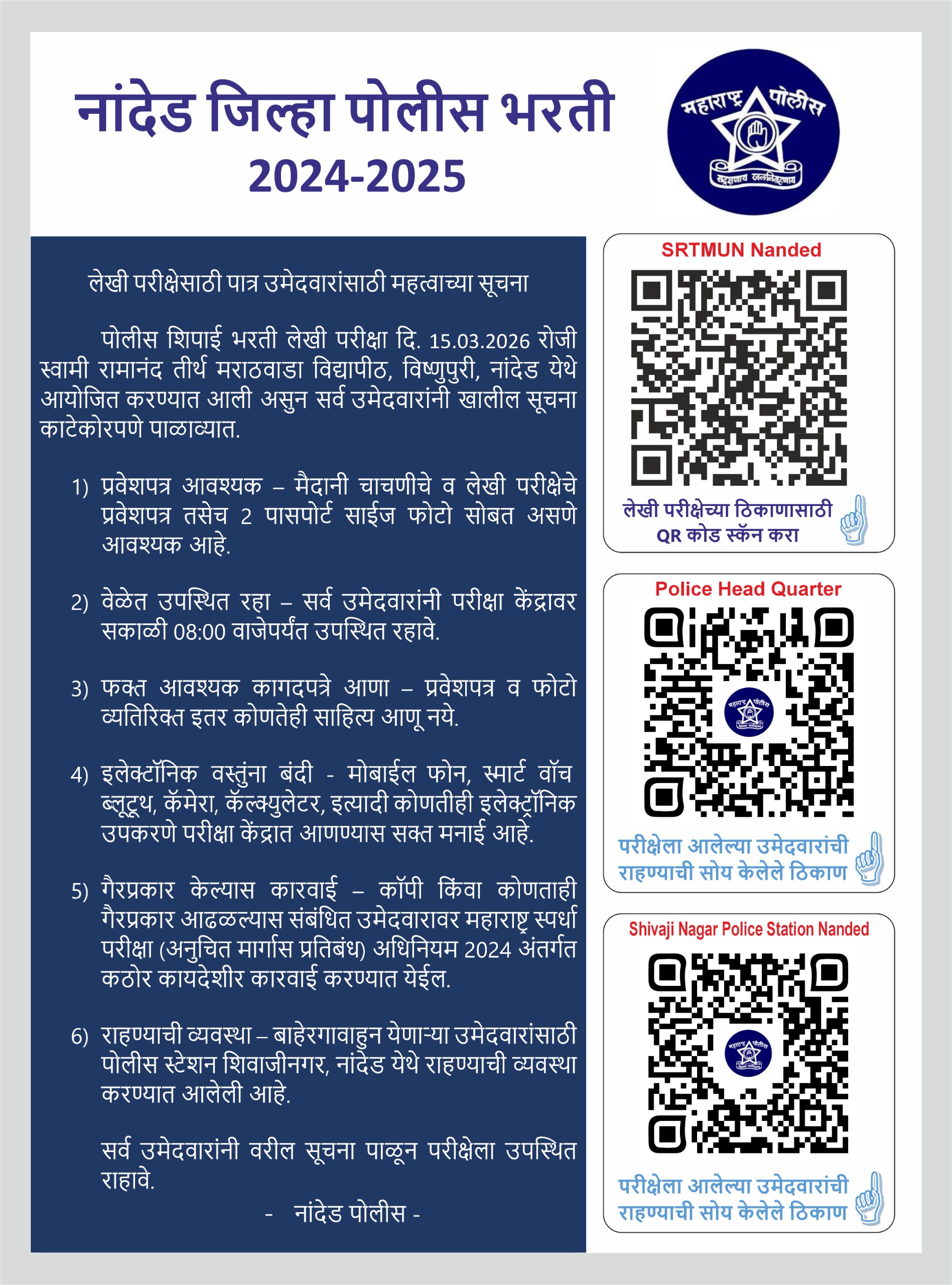 नांदेड जिल्हा पोलीस भरती 2024-2025 लेखी परीक्षा करिता उमेदवारांना सूचना |