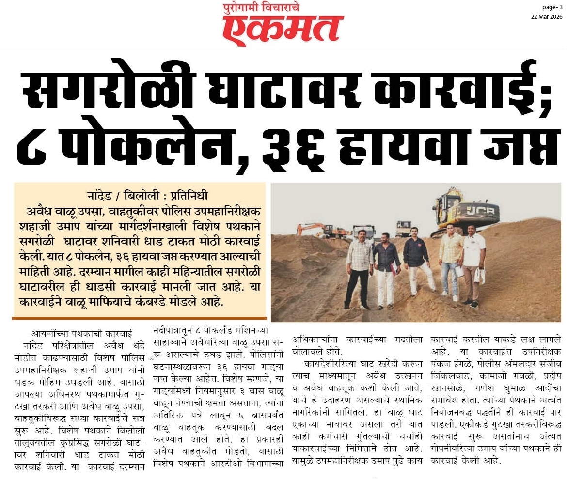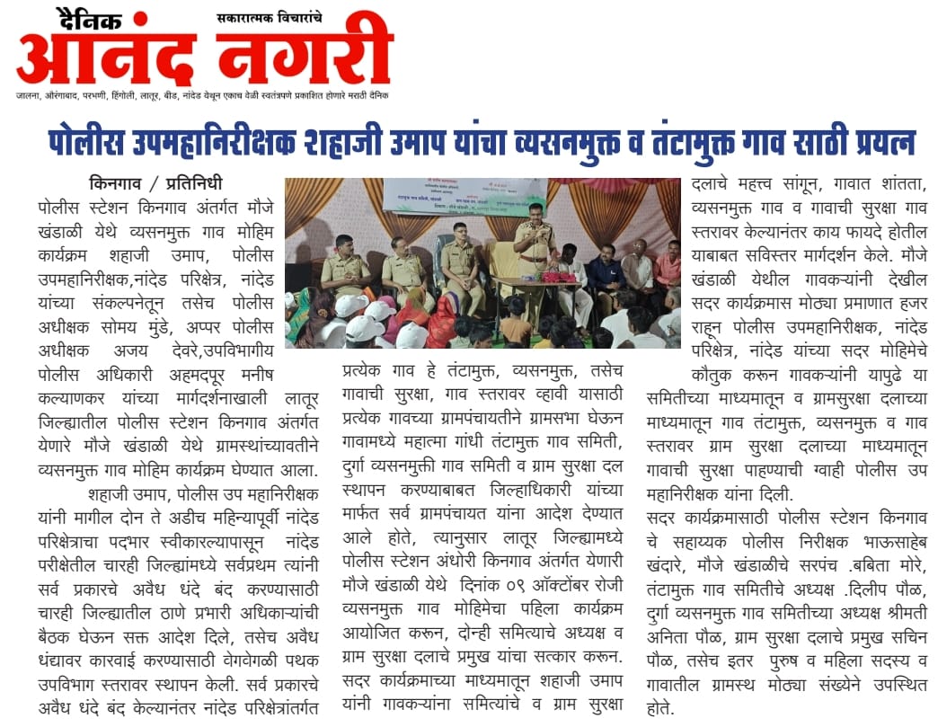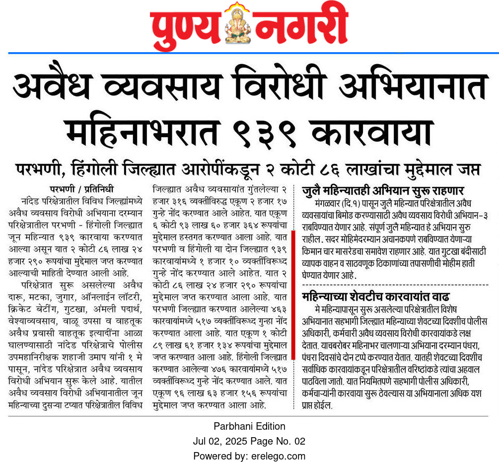 ◆ सगरोळी घाटावर धडक कारवाई; ८ पोकलेन, ३६ हायवा जप्त ◆ “डीआयजी शहाजी उमाप यांचा बुलडोजर ऑपरेशन : मटका, रेती माफिया आणि गुटखा रॅकेटवर एकाचवेळी प्रहार!” ◆ वाळूमाफियांना ‘महादणका’ उपसा करणाऱ्यांविरुद्ध कारवाई; २ कोटी ४ लाखांचा मुद्देमाल जप्त ◆ पोलीस उप महानिरीक्षक यांच्या पथकाची नांदेड मधील अवैध रेतीविरुध्द कारवाई 1 कोटी रुपयांची साधनसामुग्री व वाळू जप्त ◆ पोलीस उप महानिरीक्षक उमाप यांचा वाळू माफीयांना दणका! विमानतळ मुदखेड हद्दीत एक कोटींचा मुद्देमाल जप्त ६ आरोपी पकडले ◆ बारावीच्या परिक्षा केंद्रावर भेट ◆ पोलीस उप महानिरीक्षक यांच्या पथकाचा अवैध रेती उत्खनन व वाहतुक करणाऱ्यांवर छापा 2 कोटी रुपयांची साधनसामुग्री व वाळू जप्त ◆ पोलीस उपमहानिरीक्षक यांचे पथकाची कार्यवाही गावठी पिस्तूल, तीन जिवंत काडतूसासह आरोपी ताब्यात जुगार अड्डयावर धाड, 25 जणांवर गुन्हे दाखल ◆ पोलीस उपमहानिरीक्षक यांचे हिंगोली व नांदेड मध्ये छापे 73 लाख गुटख्यांच्या 1 कोटी 3 लाख रुपयांचा मुद्देमाल जप्त ◆ छत्रपती संभाजीनगर दैनिक लोकमत बातमी – खबर हेल्पलाईनने उडवली अवैध धंदेवाल्यांची झोप ◆ अवैध व्यवसाय विरोधी अभियान ◆ अवैध व्यवसाय विरोधी अभियान (123) अवैध व्यवसायिक हद्दपार, तर (6) जण MPDA अंतर्गत स्थानबद्ध नांदेड परिक्षेत्रात वर्षभरात 15,000 कारवाया, 109 कोटी रुपयांचा मुद्देमाल जप्त ◆ Nanded Police range seizes assets worth rs. 109 crore in year -long drive ◆ अवैध व्यवसाय विरोधी अभियान ◆ अवैध व्यवसाय विरोधी अभियान (123) अवैध व्यवसायिक हद्दपार, तर (6) जण MPDA अंतर्गत स्थानबद्ध नांदेड परिक्षेत्रात वर्षभरात 15,000 कारवाया, 109 कोटी रुपयांचा मुद्देमाल जप्त ◆ मा. पोलीस उप महानिरीक्षक श्री शहाजी उमाप यांनी हिंगोली जिल्हा पोलीस स्टेशन नरसी नामदेव येथे वार्षिक तपासणी दरम्यान भेट देवून ठाणे परिसराची पाहणी केली. ◆ खबर हेल्पलाईन 9150 100 100 ठरणार अवैध धंदेवाल्यांचा कर्दनकाळ ◆ अवैध व्यवसाय विरोधी अभियान- 5 सप्टेंबरच्या तिसऱ्या आठवड्यात सुमारे 438 कारवाया, 50 लाखाहून अधिक रक्कमेचा मुद्देमाल जप्त. ◆ नांदेड परिक्षेत्रातील गैरप्रकार व अवैध व्यवसायांच्या निर्मूलनासाठी आता हेल्पलाइन खबर पालकमंत्री मा. ना. श्री अतुल सावे यांचे हस्ते शुभारंभ ◆ नांदेड परिक्षेत्रातील पोलीस ठाण्यांच्या मूल्यमापनात सोनखेड पोलीस ठाणे सलग चौथ्यांना अव्वल ◆ जून मध्ये 2000 कारवाया, सात कोटींचा मुद्देमाल जप्त ◆ अवैध व्यवसाय विरोधी अभियानात महिनाभरात 939 कारवाया ◆ अवैध व्यवसाय अभियान -2 : सात कोटींचा मुद्देमाल जप्त ◆ नि:शस्त्र पोलीस निरीक्षकांच्या परिक्षेत्रांतर्गत सार्वत्रिक बदल्या - २०२५ ◆ नि:शस्त्र पोलीस उप निरीक्षकांच्या परिक्षेत्रांतर्गत सार्वत्रिक विनंती बदल्या - २०२५ ◆ नि:शस्त्र पोलीस उ