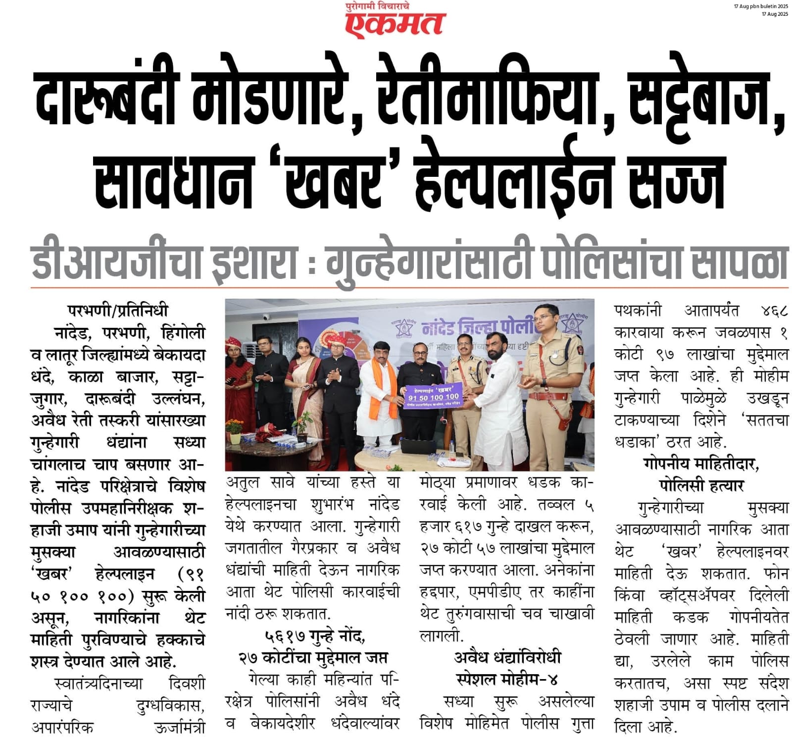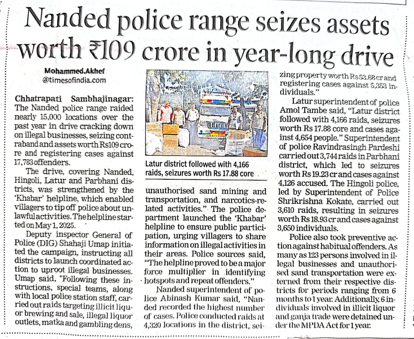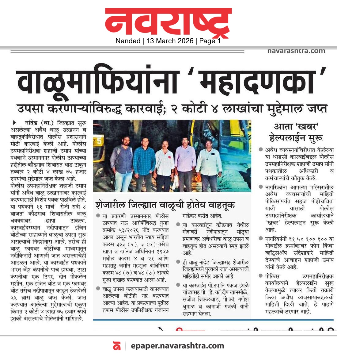 ◆ सगरोळी घाटावर धडक कारवाई; ८ पोकलेन, ३६ हायवा जप्त ◆ “डीआयजी शहाजी उमाप यांचा बुलडोजर ऑपरेशन : मटका, रेती माफिया आणि गुटखा रॅकेटवर एकाचवेळी प्रहार!” ◆ वाळूमाफियांना ‘महादणका’ उपसा करणाऱ्यांविरुद्ध कारवाई; २ कोटी ४ लाखांचा मुद्देमाल जप्त ◆ पोलीस उप महानिरीक्षक यांच्या पथकाची नांदेड मधील अवैध रेतीविरुध्द कारवाई 1 कोटी रुपयांची साधनसामुग्री व वाळू जप्त ◆ पोलीस उप महानिरीक्षक उमाप यांचा वाळू माफीयांना दणका! विमानतळ मुदखेड हद्दीत एक कोटींचा मुद्देमाल जप्त ६ आरोपी पकडले ◆ बारावीच्या परिक्षा केंद्रावर भेट ◆ पोलीस उप महानिरीक्षक यांच्या पथकाचा अवैध रेती उत्खनन व वाहतुक करणाऱ्यांवर छापा 2 कोटी रुपयांची साधनसामुग्री व वाळू जप्त ◆ पोलीस उपमहानिरीक्षक यांचे पथकाची कार्यवाही गावठी पिस्तूल, तीन जिवंत काडतूसासह आरोपी ताब्यात जुगार अड्डयावर धाड, 25 जणांवर गुन्हे दाखल ◆ पोलीस उपमहानिरीक्षक यांचे हिंगोली व नांदेड मध्ये छापे 73 लाख गुटख्यांच्या 1 कोटी 3 लाख रुपयांचा मुद्देमाल जप्त ◆ छत्रपती संभाजीनगर दैनिक लोकमत बातमी – खबर हेल्पलाईनने उडवली अवैध धंदेवाल्यांची झोप ◆ अवैध व्यवसाय विरोधी अभियान ◆ अवैध व्यवसाय विरोधी अभियान (123) अवैध व्यवसायिक हद्दपार, तर (6) जण MPDA अंतर्गत स्थानबद्ध नांदेड परिक्षेत्रात वर्षभरात 15,000 कारवाया, 109 कोटी रुपयांचा मुद्देमाल जप्त ◆ Nanded Police range seizes assets worth rs. 109 crore in year -long drive ◆ अवैध व्यवसाय विरोधी अभियान ◆ अवैध व्यवसाय विरोधी अभियान (123) अवैध व्यवसायिक हद्दपार, तर (6) जण MPDA अंतर्गत स्थानबद्ध नांदेड परिक्षेत्रात वर्षभरात 15,000 कारवाया, 109 कोटी रुपयांचा मुद्देमाल जप्त ◆ मा. पोलीस उप महानिरीक्षक श्री शहाजी उमाप यांनी हिंगोली जिल्हा पोलीस स्टेशन नरसी नामदेव येथे वार्षिक तपासणी दरम्यान भेट देवून ठाणे परिसराची पाहणी केली. ◆ खबर हेल्पलाईन 9150 100 100 ठरणार अवैध धंदेवाल्यांचा कर्दनकाळ ◆ अवैध व्यवसाय विरोधी अभियान- 5 सप्टेंबरच्या तिसऱ्या आठवड्यात सुमारे 438 कारवाया, 50 लाखाहून अधिक रक्कमेचा मुद्देमाल जप्त. ◆ नांदेड परिक्षेत्रातील गैरप्रकार व अवैध व्यवसायांच्या निर्मूलनासाठी आता हेल्पलाइन खबर पालकमंत्री मा. ना. श्री अतुल सावे यांचे हस्ते शुभारंभ ◆ नांदेड परिक्षेत्रातील पोलीस ठाण्यांच्या मूल्यमापनात सोनखेड पोलीस ठाणे सलग चौथ्यांना अव्वल ◆ जून मध्ये 2000 कारवाया, सात कोटींचा मुद्देमाल जप्त ◆ अवैध व्यवसाय विरोधी अभियानात महिनाभरात 939 कारवाया ◆ अवैध व्यवसाय अभियान -2 : सात कोटींचा मुद्देमाल जप्त ◆ नि:शस्त्र पोलीस निरीक्षकांच्या परिक्षेत्रांतर्गत सार्वत्रिक बदल्या - २०२५ ◆ नि:शस्त्र पोलीस उप निरीक्षकांच्या परिक्षेत्रांतर्गत सार्वत्रिक विनंती बदल्या - २०२५ ◆ नि:शस्त्र पोलीस उ